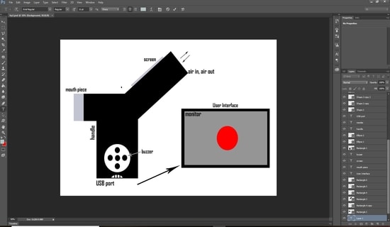 In my 2D design I have started with photoshop because I have a little background on how to use it. In photoshop, each shape, text or object created is called a “layer”. So, I have created my layers (shapes) and joined them together to create my 2D model. This is my final design in photoshop which is basically the front view of the device.