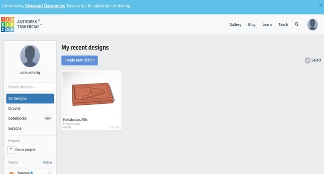 Then, I have signed in using my Autodesk account and I got this page, I clicked on “Create new design” to start building my 3D model.