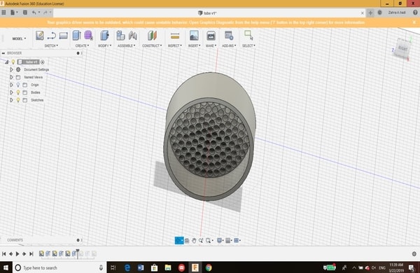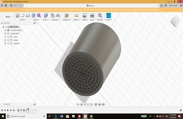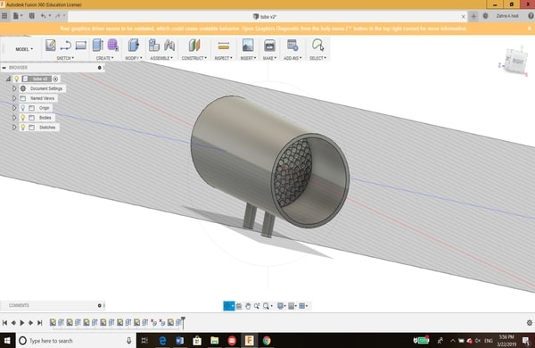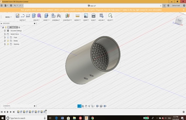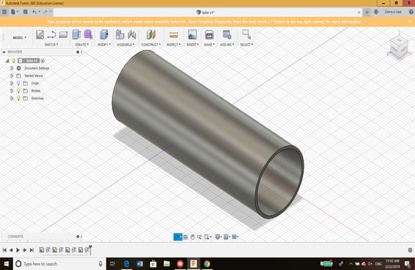 This was just the start and to get familiar with the software. After that, I have learned that for each 3D design, the sketch must be drawn first. My colleague has helped me a lot in learning the basics of 3D design. Therefore, I decided to draw the 3D model of a tube that will be used as a flowmeter in my spirometer project (My final project). Here is the steps on how I designed the tube: