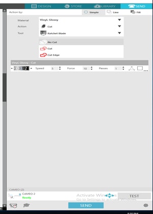 10- Now you are ready to cut your sticker. Click on Send from the top right > then choose the material that you will cut > select the action to “cut” > the parameters of speed, force and passes will be shown > after all the settings confirmed, click on the “send” button and your machine will start cutting.