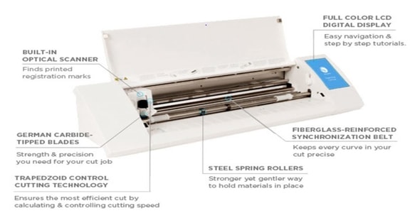 The Vinylcutter used in this assignment is Silhouette Cameo 2 which is an electronic cutting machine that can be plugged directly into the PC via a USB cable exactly like a printer. However, it uses a small blade to cut paper, cardstock, vinyl, fabric and more up to 12in wide and 10 feet long. The machine comes with Silhouette Studio software for cutting and printing the desired shapes and objects. Also, the machine comes with a 12” Cutting Mat to support the cutting media. The figure below shows the basic parts of the Silhouette CAMEO® 2