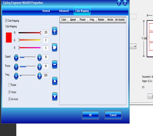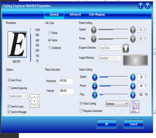 10- Open your PDF file and click on file > print > properties and you will see the following window. Based on the material that we want to cut, chose the laser speed, power and frequency.