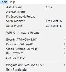 3- Then, from the tools, I have changed the board from Arduino uno to ATTINY44.