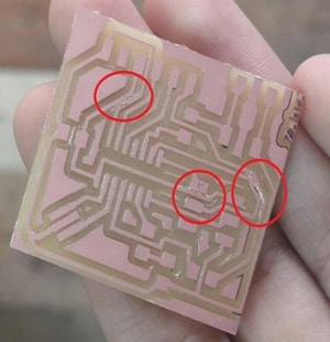 After milling my PCB, I noticed that some of the tracks are linked togather. Therefore, I used cutter to separate them and doing the continuity test to make sure that they are not connected. This might happened because of the designing rules of my PCB.