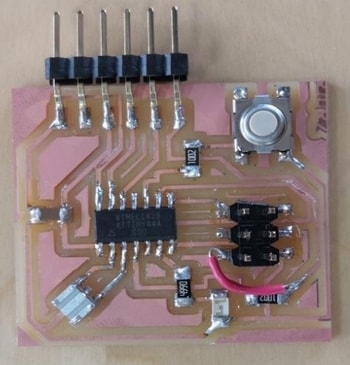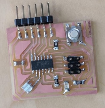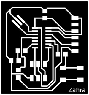 After generating both files for the outline and traces from fab modules, 1-layer PCB has been placed on the SRM machine to be cut. Firstly, the traces have been milled then the outline.This has been done following excatly the same steps mentioned in week5