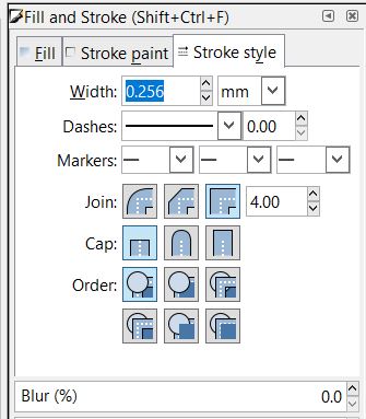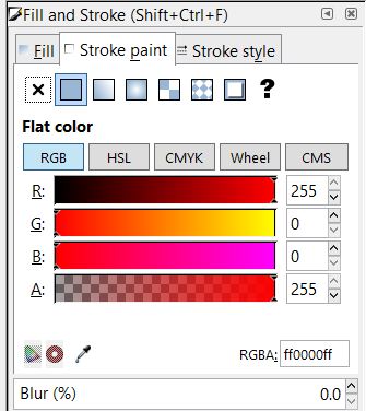2- Next, I have selected all the objects and from the Fill and Stroke properties, I edited the Fill to be “No paint”, Stroke paint to flat color > (R=255, G=0, B=0, A=255) and the Stroke width to 0.265 mm.