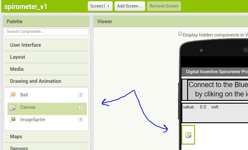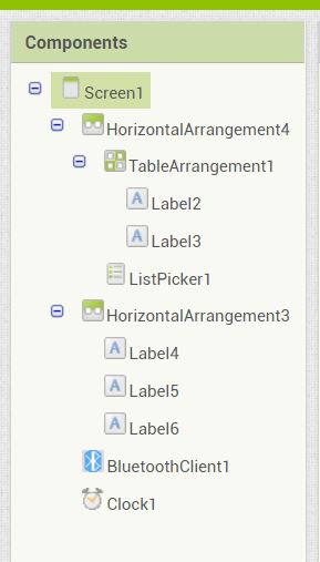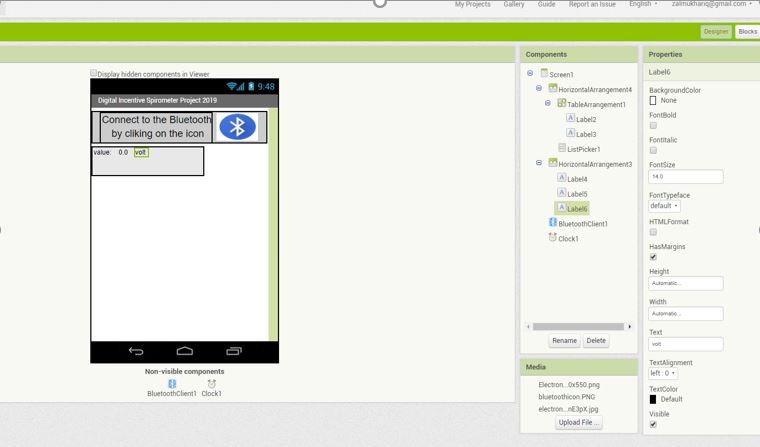 So, I have clicked on the “Create Apps!” to start creating my mobile app. The picture below shows the design window where all the components of the app have been set. Components used such as: labels, canvas (for plotting graph), Bluetooth and clock. From the properties window in the right side I have edited the sizes, names, text colors, etc.