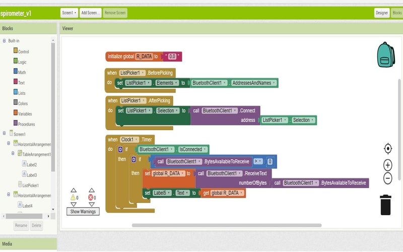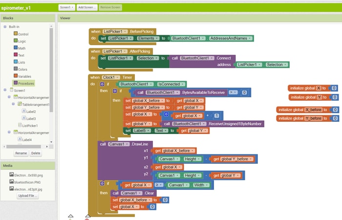 The picture below is the blocks window and it shows the code written for the app. Firstly, the variables have been initialized. Then, the connection with the mobile app set when the user selects the Bluetooth device. Finally, when the Bluetooth is connected, we start receive the values of the sensor into the app.