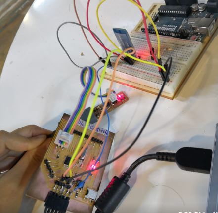 The first step taken is to connect the sensor and the bluetooth module to the micro-controller board and program it in a way to transmit the data to the mobile app by bluetooth.