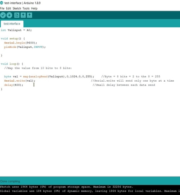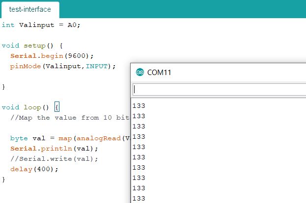 byte val = map(analogRead(Valinput),0,1024.0,0,255); //Byte = 8 bits = 2 to the 8 = 255
