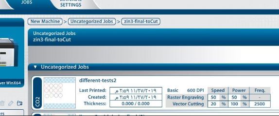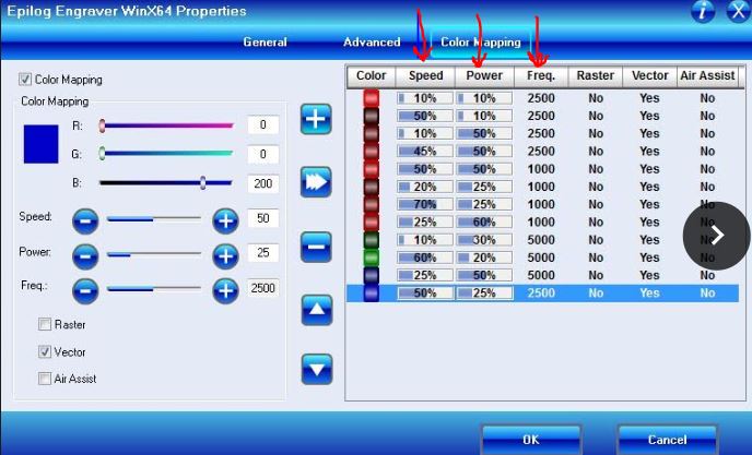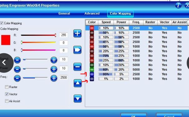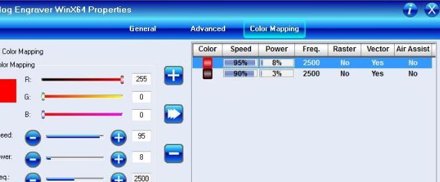 You can see that for each RGB color code, I have changed the speed, power frequency. So, each cirle will be cut with different settings.