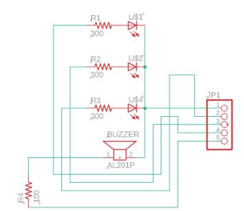 Finally, I have created a PCB for the LEDs and buzzer which will be fit in the box that I have designed ealier. For designing the circuit, I have used eagle software from Autodesk. I started with the schematic by placing the compponents and do the wiring. The figure below shows the schematic: