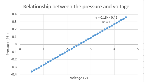 The equation obtained from this graph is: Pressure = 0.18(voltage) – 0.45