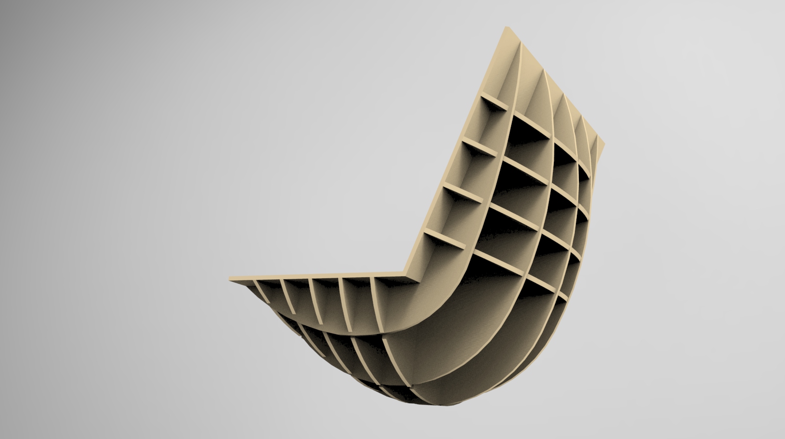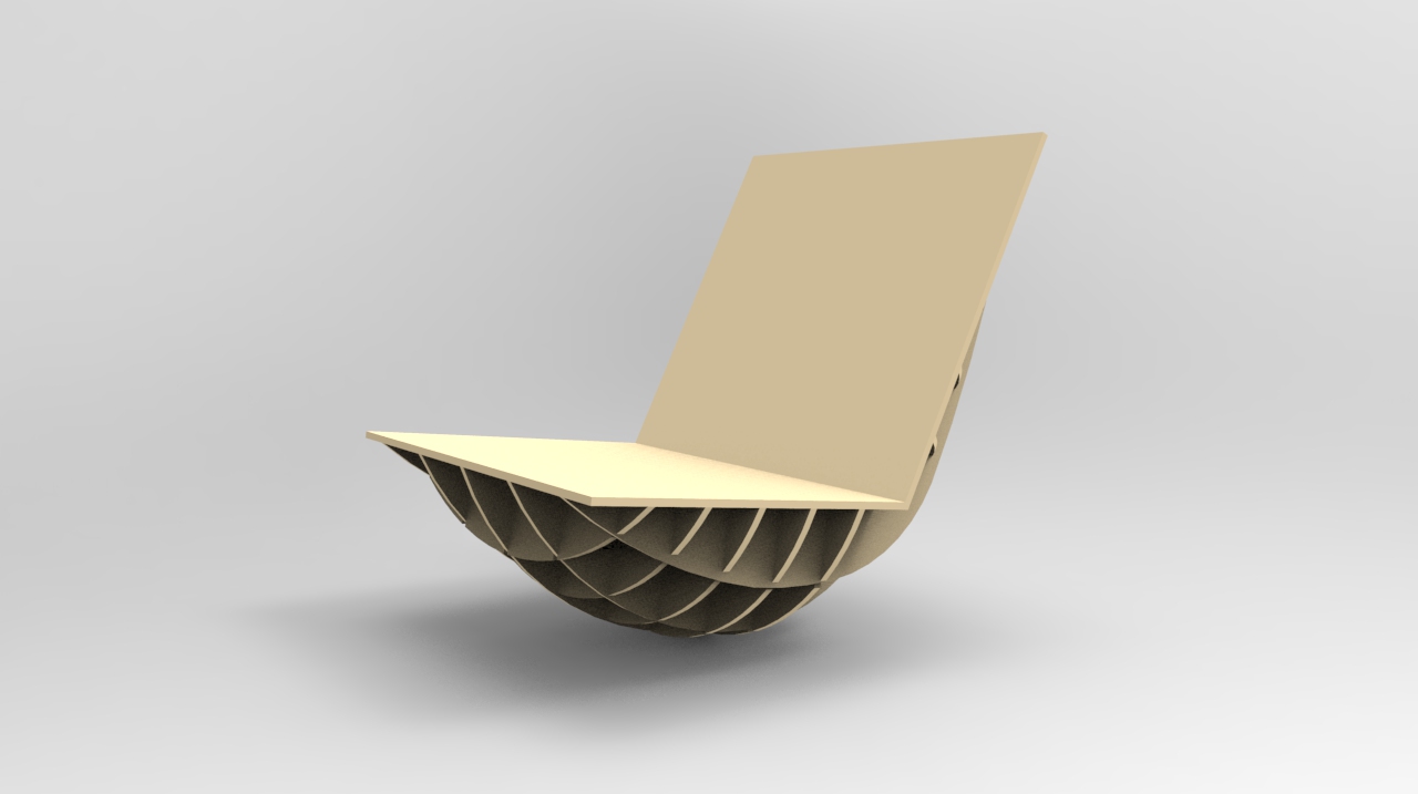 For this assignment I chose to redesign an old project I made 4 years ago. The project was about designing a chair made of plywood slices, with no glued or screwed joints. The original idea considered to design a chair out of a sphere by volume substraction turning the chair into a 360 rotation rocking chair. The first model was design with Creo Parametric software and rendered with Keyshot. Here there are a couple of renders of the original idea: