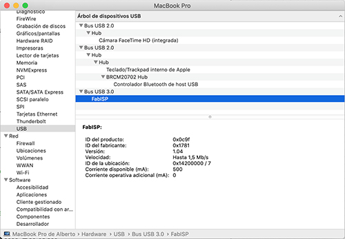 Then check on the "About this Mac" Menu, if the FabISP USB appears correctly on the USB-tree hub.