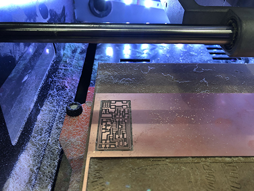 For the cutting process, after setting the position for the 3 axis, I set the order "Cut" on the Roland VPanel Software, and the milling machine starts cutting the inner part with the 1/64" milling bit. Then repeat the same proces for the outline .rml file, changing to the 1/32" milling bit in the machine.