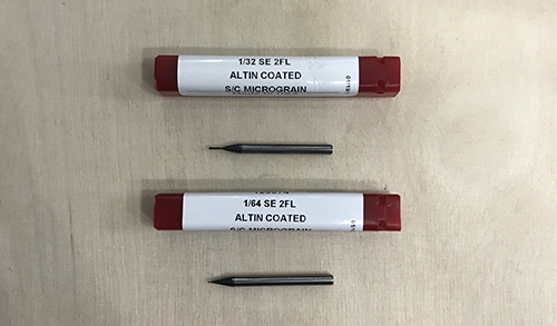 We are given two different milling bits to process the PCB. The 1/64" tip, to engrave the inner circuit, and the 1/32" tip, used for drilling holes and cutting the board's outline.