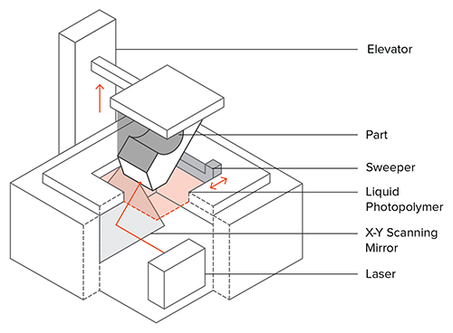 - Stereolithography (SLA): is an additive manufacturing process that belongs to the Vat Photopolymerization family. In SLA, an object is created by selectively curing a polymer resin layer-by-layer using an ultraviolet (UV) laser beam. The materials used in SLA are photosensitive thermoset polymers that come in a liquid form.