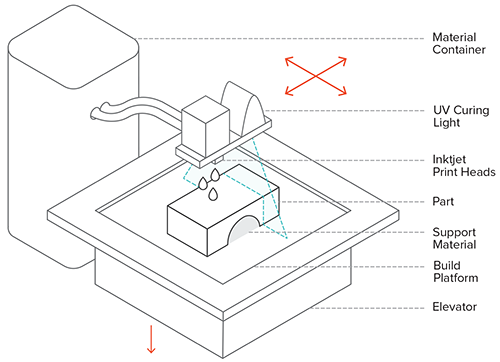 - Material Jetting (MJ): is an additive manufacturing process that operates in a similar fashion to 2D printers. In material jetting, a printhead (similar to the printheads used for standard inkjet printing) dispenses droplets of a photosensitive material that solidifies under ultraviolet (UV) light, building a part layer-by-layer. The materials used in MJ are thermoset photopolymers (acrylics) that come in a liquid form.