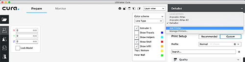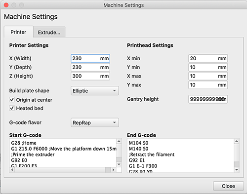 For Slic3 Prusa software, there won't be necessary to change the printers settings, but for the Cura, in case we want to change the printer model we should make the following changes: