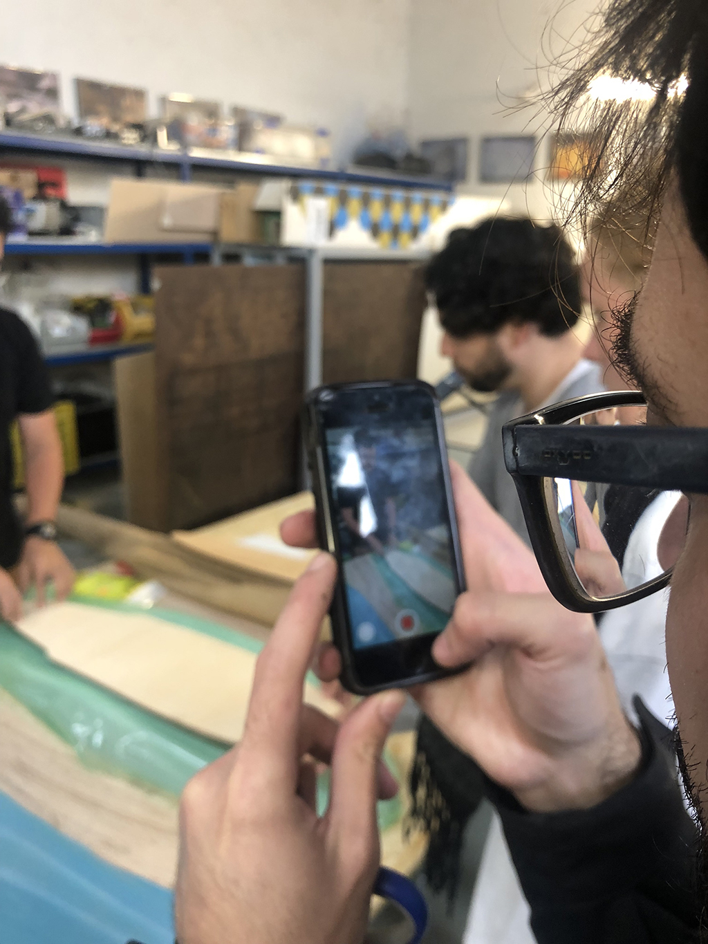 Another technique we worked is the wood bending by pressure. In this case we made a skateboard with a multilayer raftwood structure. This kind of wood has very good bending properties in one direction, but to keep the shape we want, we need to apply epoxy between the layers. As it takes around 1 day for the epoxy to get dry, we will need to keep the piece inside a mold for the whole process.