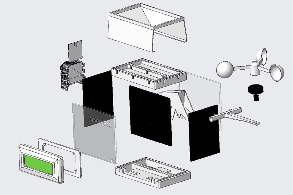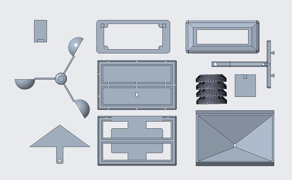 The hardware components (LCD screen, Stevenson screen, rain gauge basin and anemometer) due to their modularity, can be attathed or removed easily with clips to the upper and lower bases of the main case. So the mechanical components can be divided into: