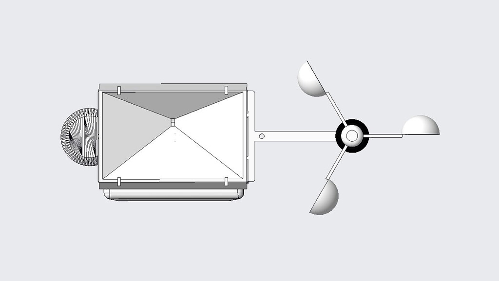 The anemometer is divided in three different parts: the branch that separates the mechanism from the box, the 3 blade anemometer that encloses the magnet for the hall sensor, and the bearing-screw-nut joint that will make the blades turn free around the endpoint of the branch.