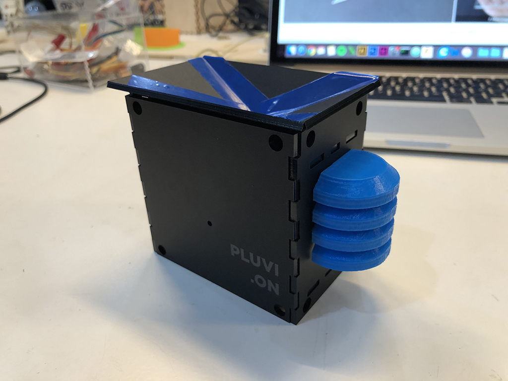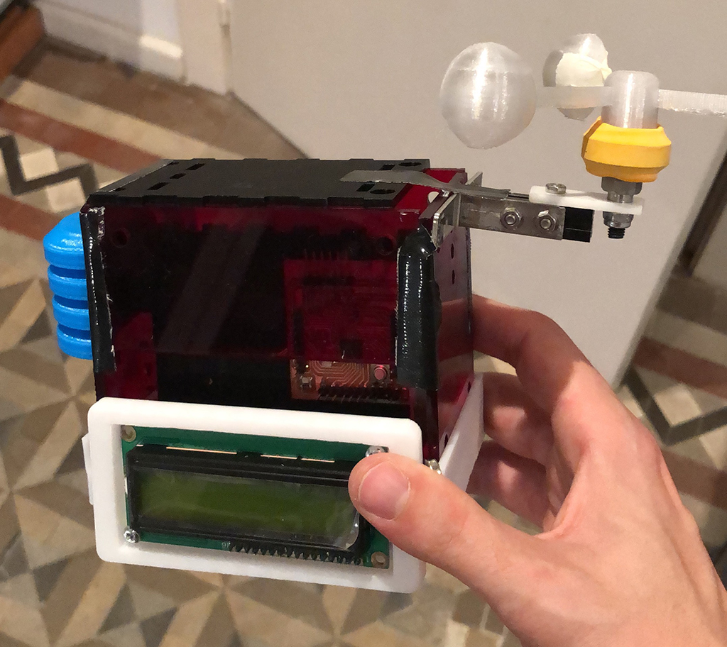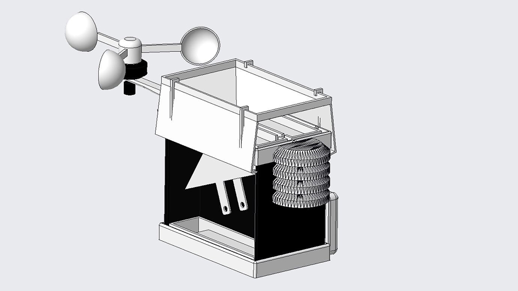 The rain gauge is made of a 3d printed arrow model that I got again from the same Pluvi.On community, that swings around an axis attatched to the middle wall in the case.