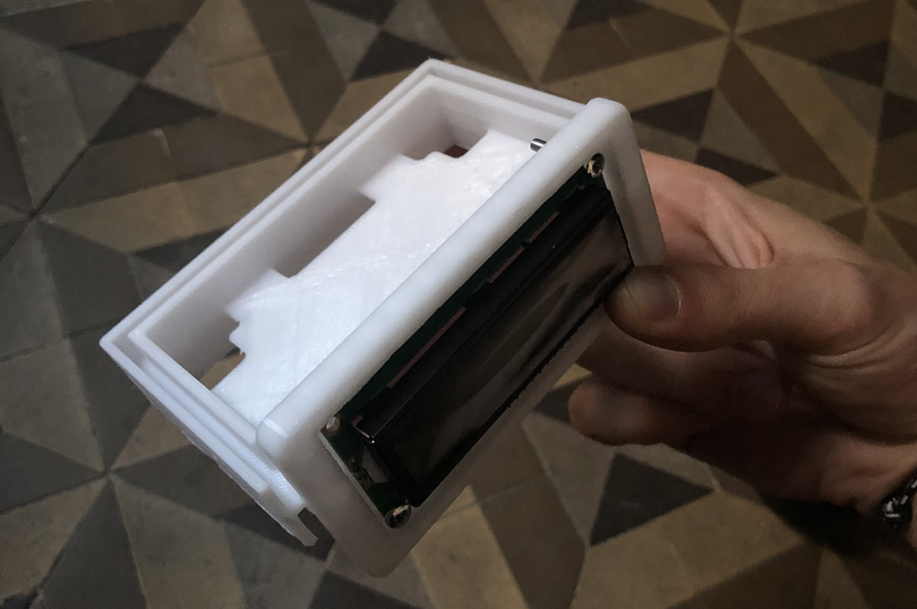 The display is enclosed into a 3d printed PLA case to protect it from the outdoors and to clip it to the bottom base.