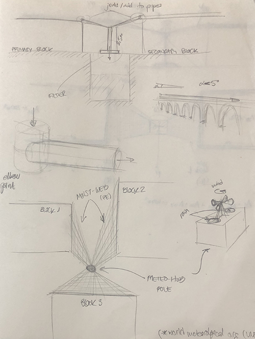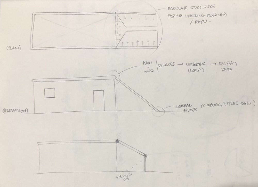 This project just worked as an isolated structure to gather a small quantity of water, empowering its symbolism as a reference of what it meant. Furthermore, deeper environmental systems should be developed for this structural space as a meteo station to become a tool for measuring the data from the environment due to the lack of this kind of data among these rural areas. That is why I for the final project I will focus on designing and producing this device to be easily used as a data receiver and sender.