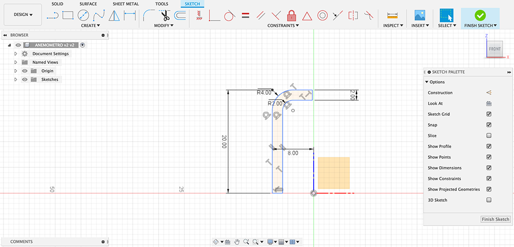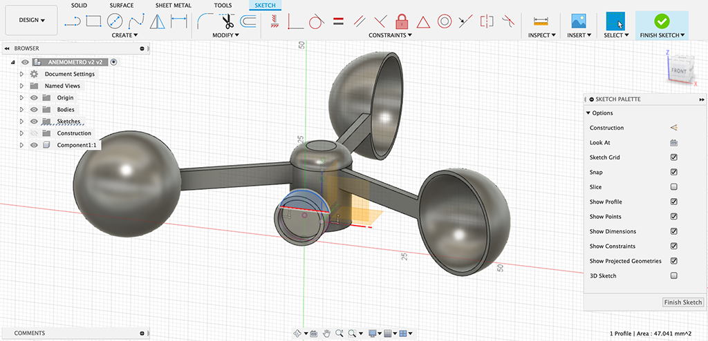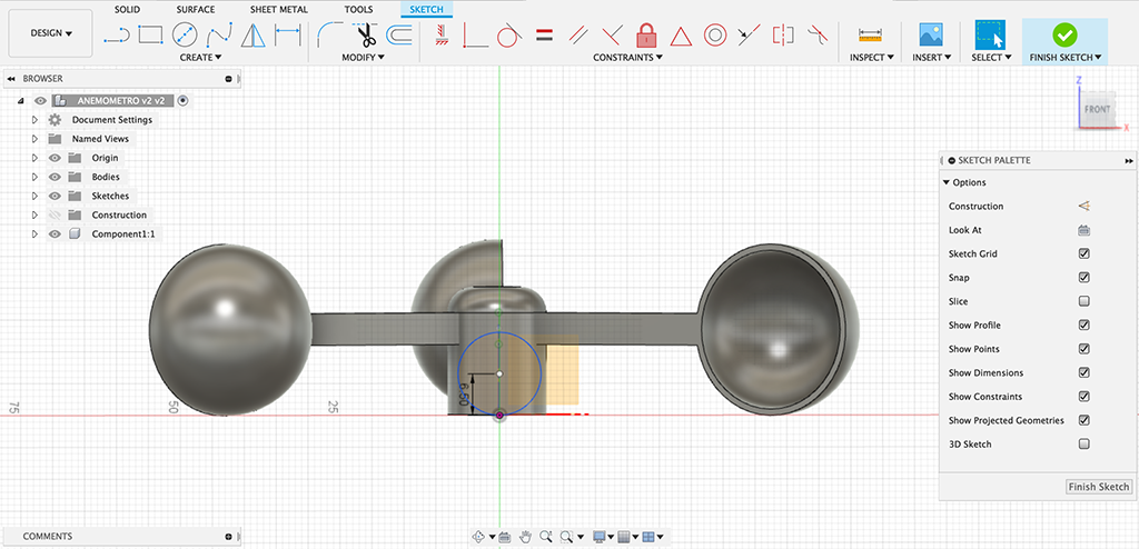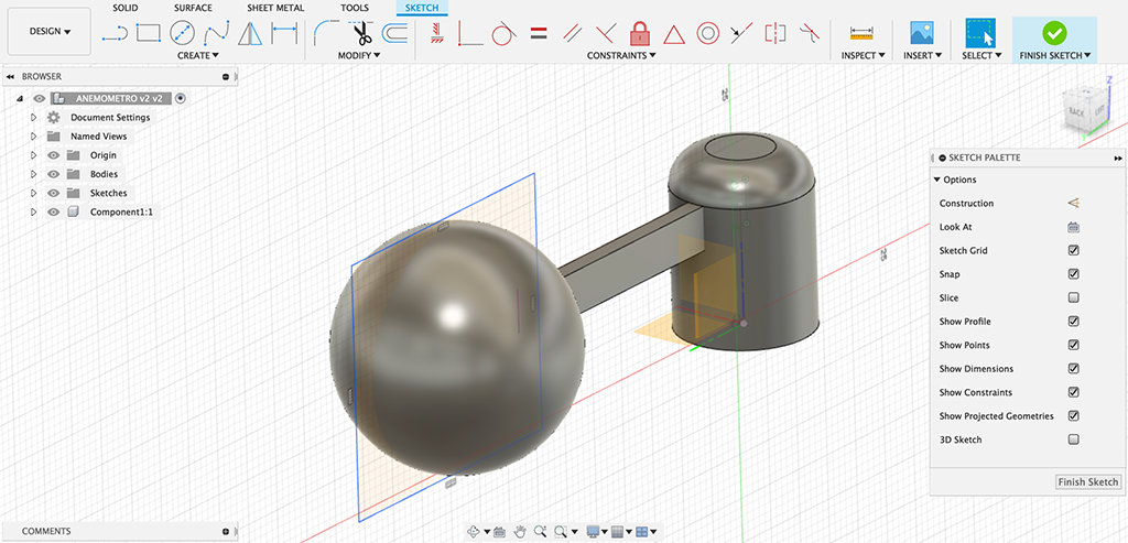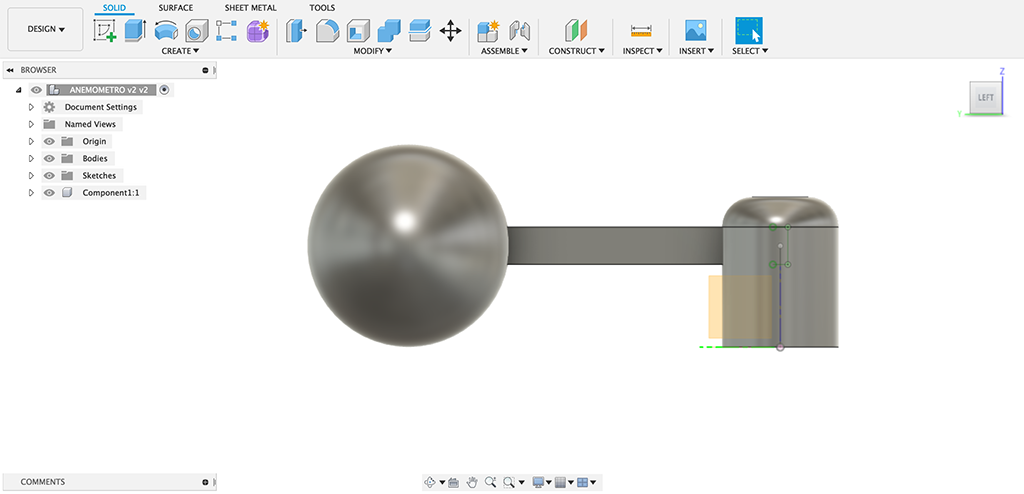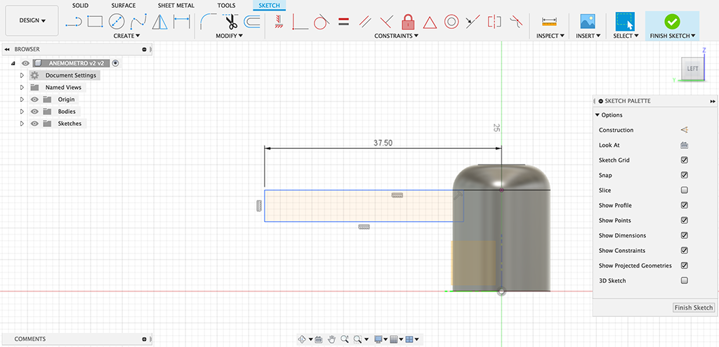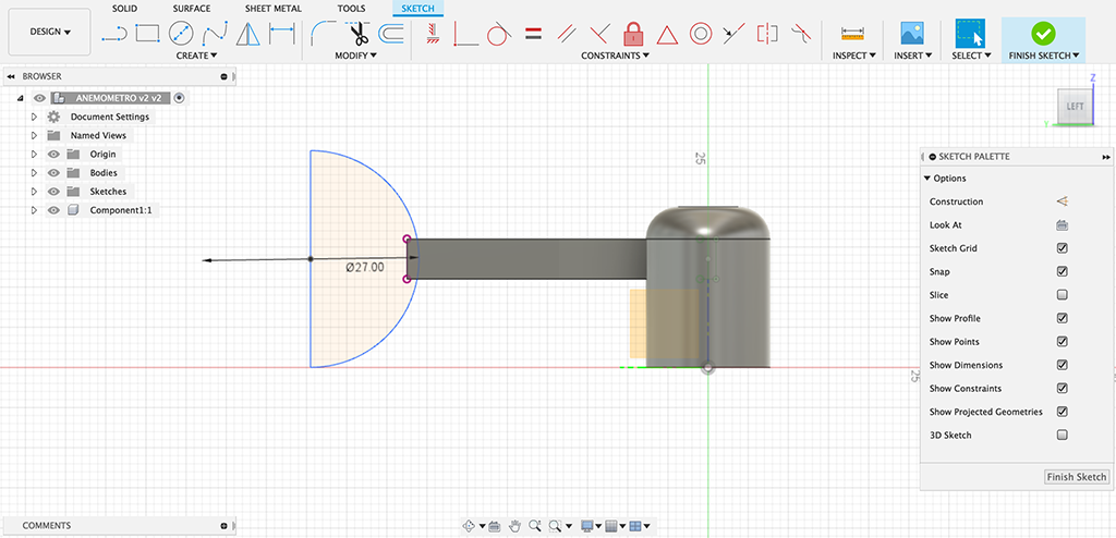 Next step is defining an anemometer's arm, so I select the lateral plane to draw a sketch that I'll extrude symetrically later: