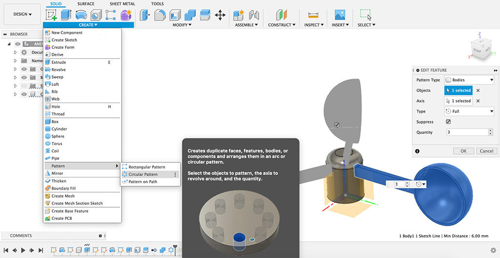 Now that I have this last part finished, I can make a circular pattern of it with 3 elements around the piece's central axis: