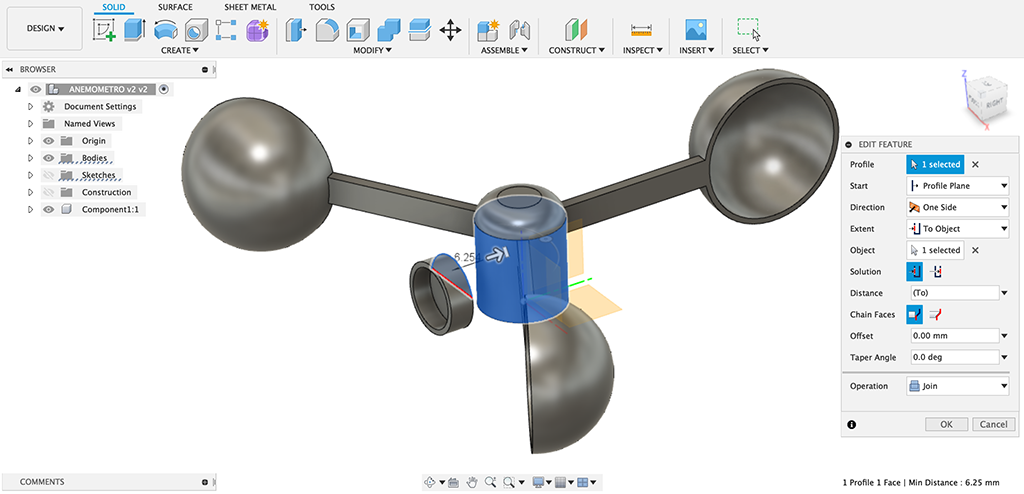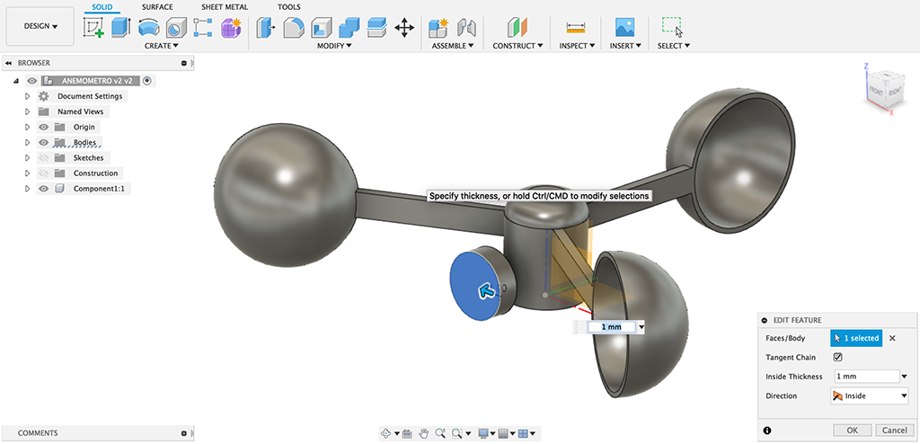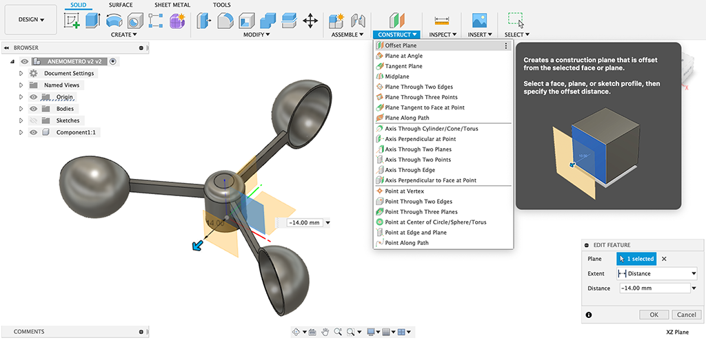 Finally I just need to make the room to keep the magnet that will activate the hall sensor circuit inside the anemometer. I am starting creating an offset plane to draw the circle where the magnet will be stucked: