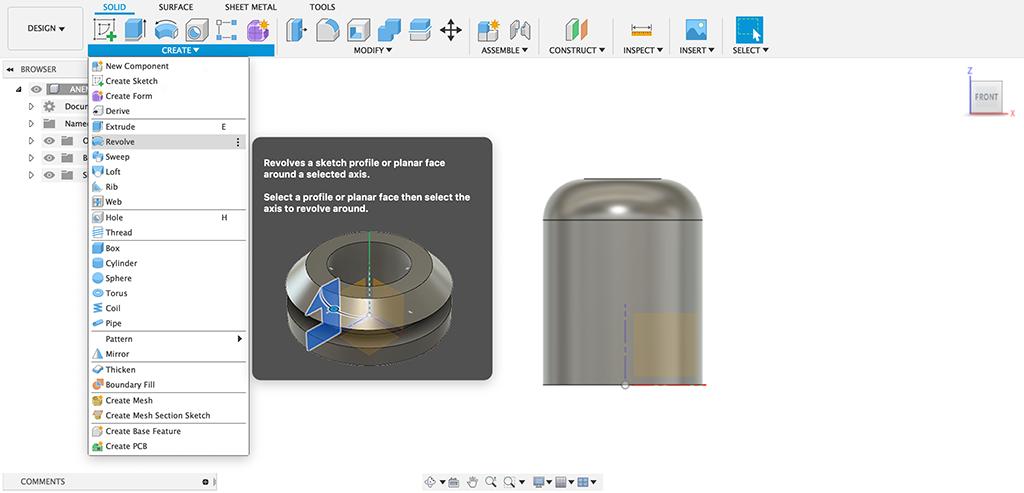 Then on the Toolbar, I selected from the Create menu, the revolve tool: