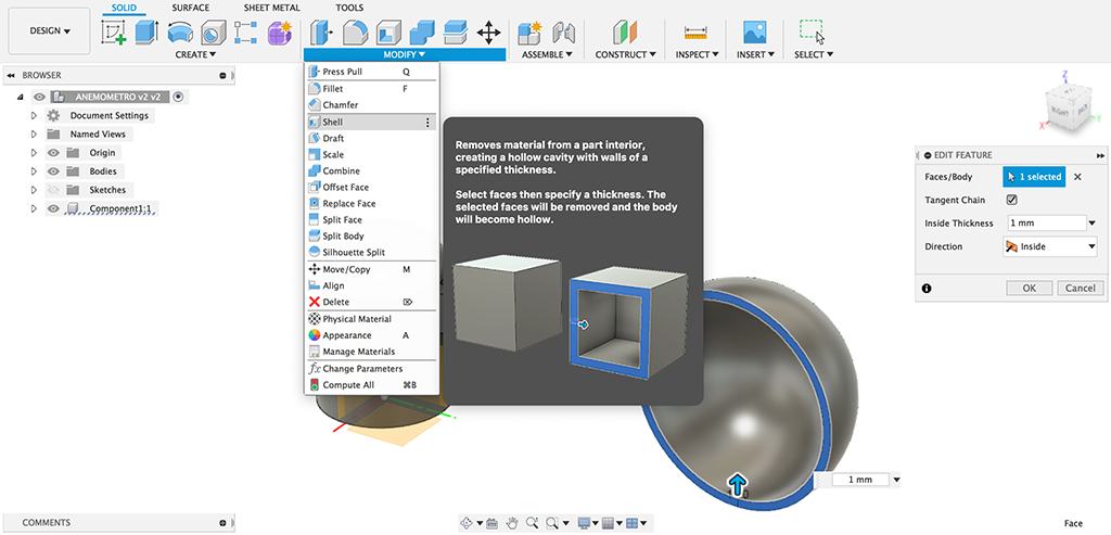 Then I'll make a shell from the semisphere I got of 1mm thick: