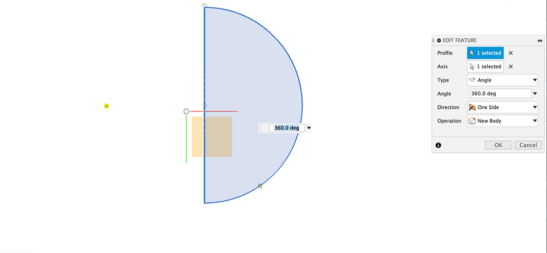 To design the anemometer's scoop, I will first design a semicircle at the end of the arm to revolve it later and make a sphere using the same revolve function: