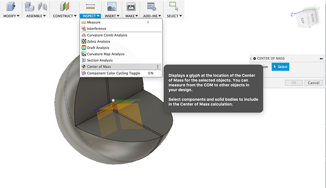 So again in the Toolbar menu, I select Center of mass inside the Inspect menu.