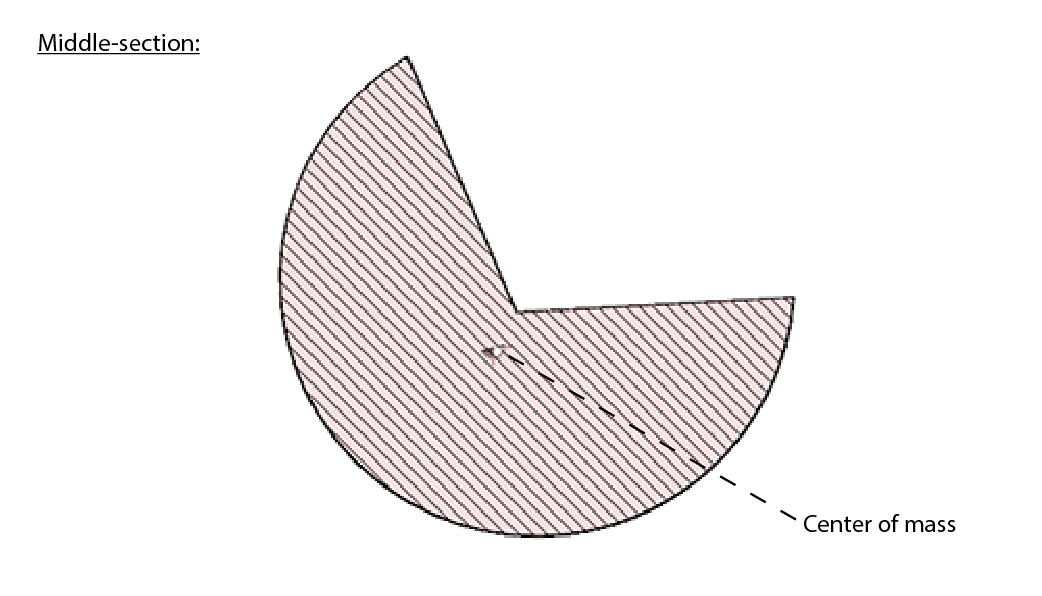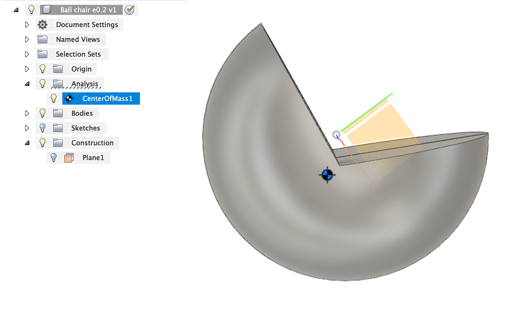Its spherical base will demand a center mass calculation to guarantee its stability, and this is a good chance to discover new tools from the software. Center of mass point and middle-section of the model are shown in the following picture: