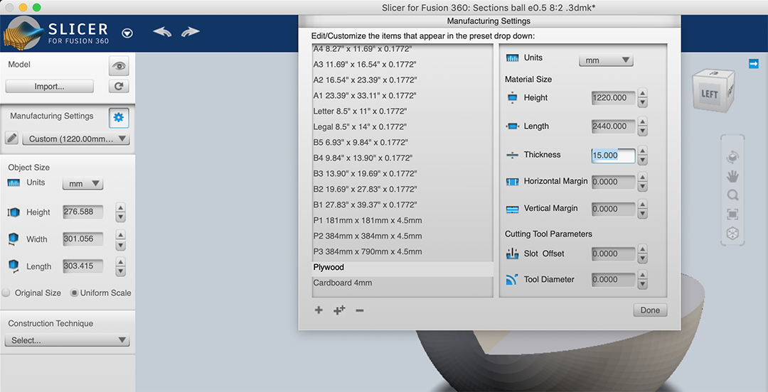 Then we choose the kind of material, its thickness, the original material format. In my case a plywood 15mm board (2440x1220).