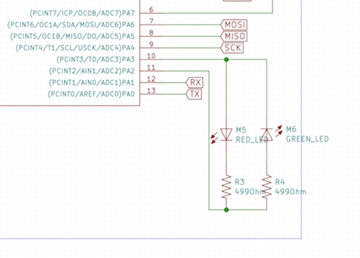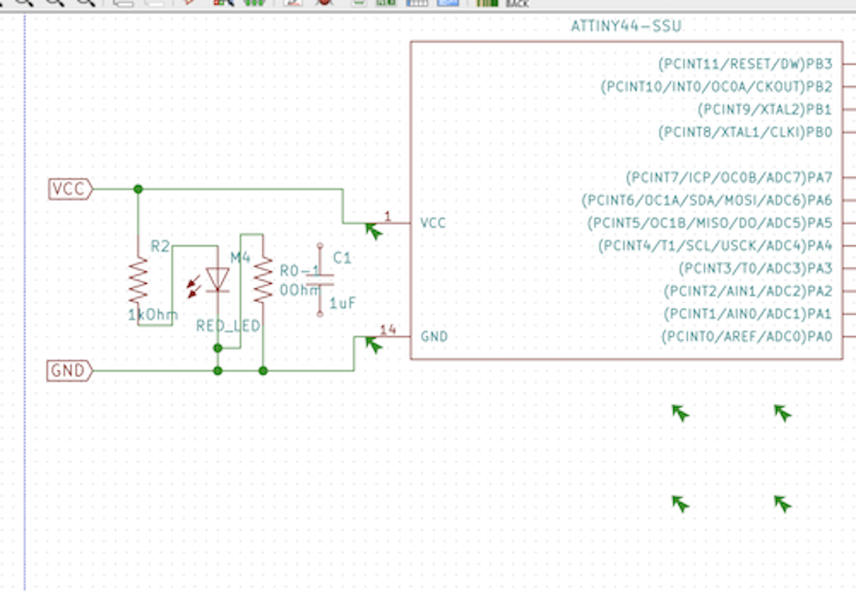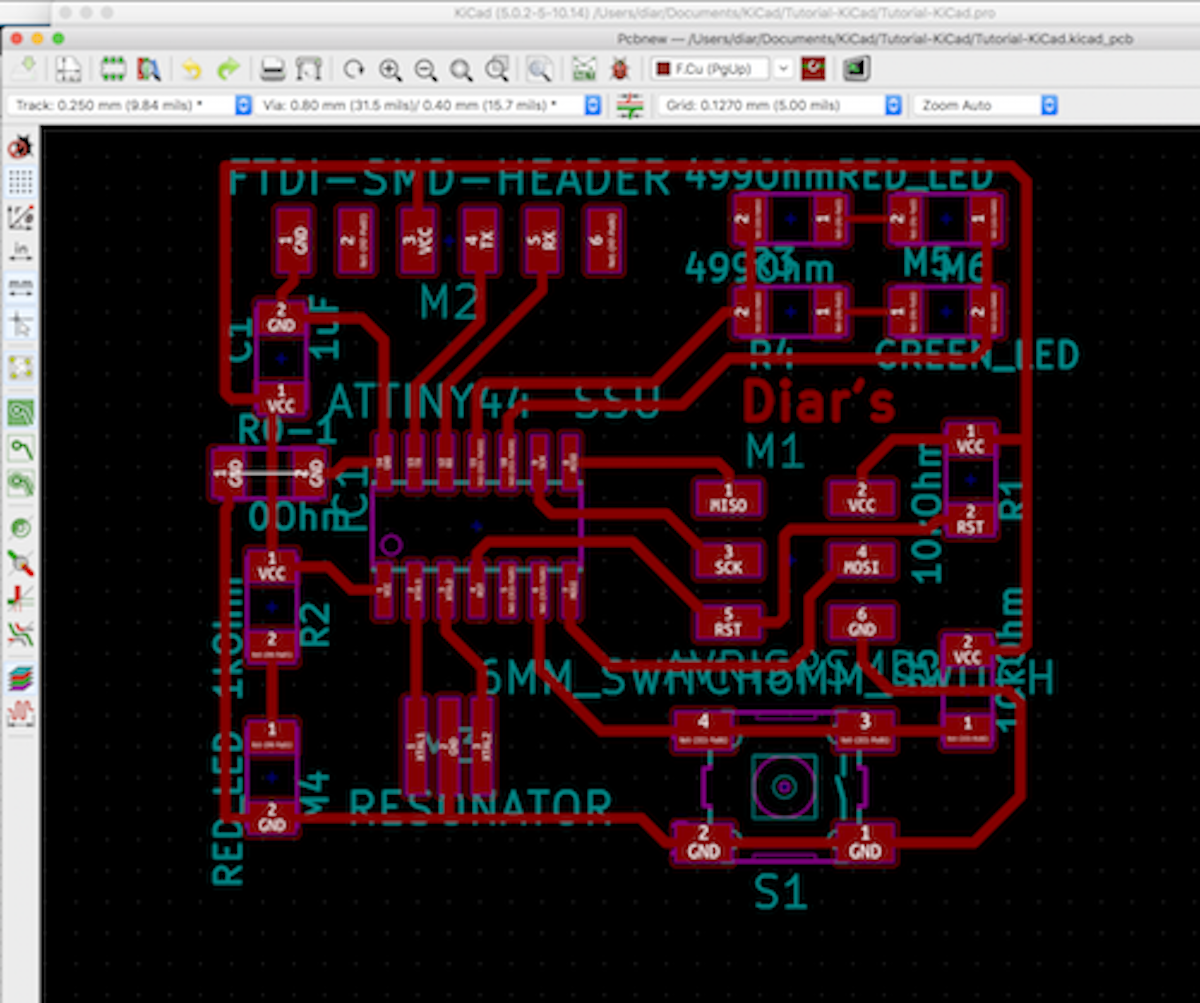 The PCB had to be feeded via the FTDI connecter, so while designing the board I had to make sure, that the pins are well connected. For that I also used the schematic of the ATtiny44 pinouts.