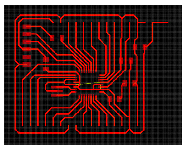 So I had to change the width of the traces from 10 to 14. Actually Actually they should have been 16, but then, in some parts, the traces were too narrow to each other, as shown in this example:
