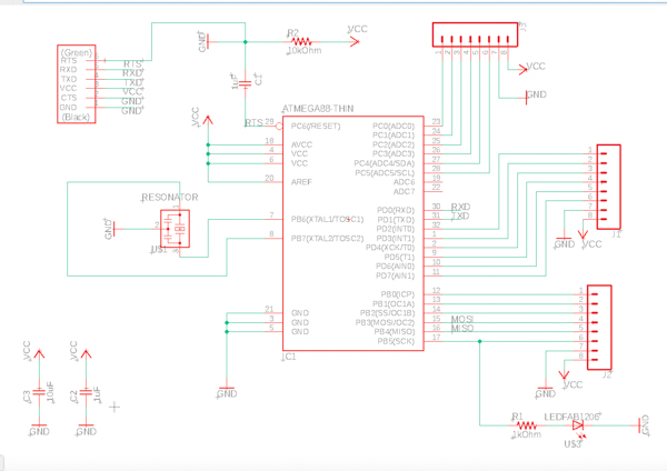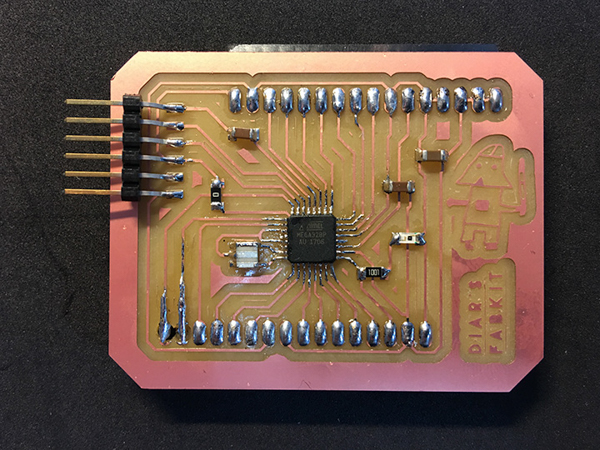 To program the FabKit I used my Fab ISP. I had to make sure that the wires are well connected and checked the pin out of both PCBs.