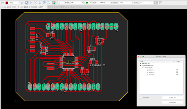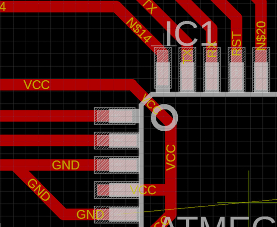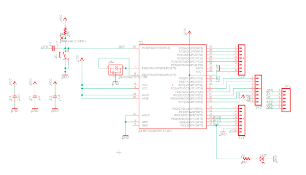 I copied from all three examples the part I liked most and started to re-design the PCB. I changed little thing, as e.g. by leaving out the reset button. So for this PCB I used to at least these components: