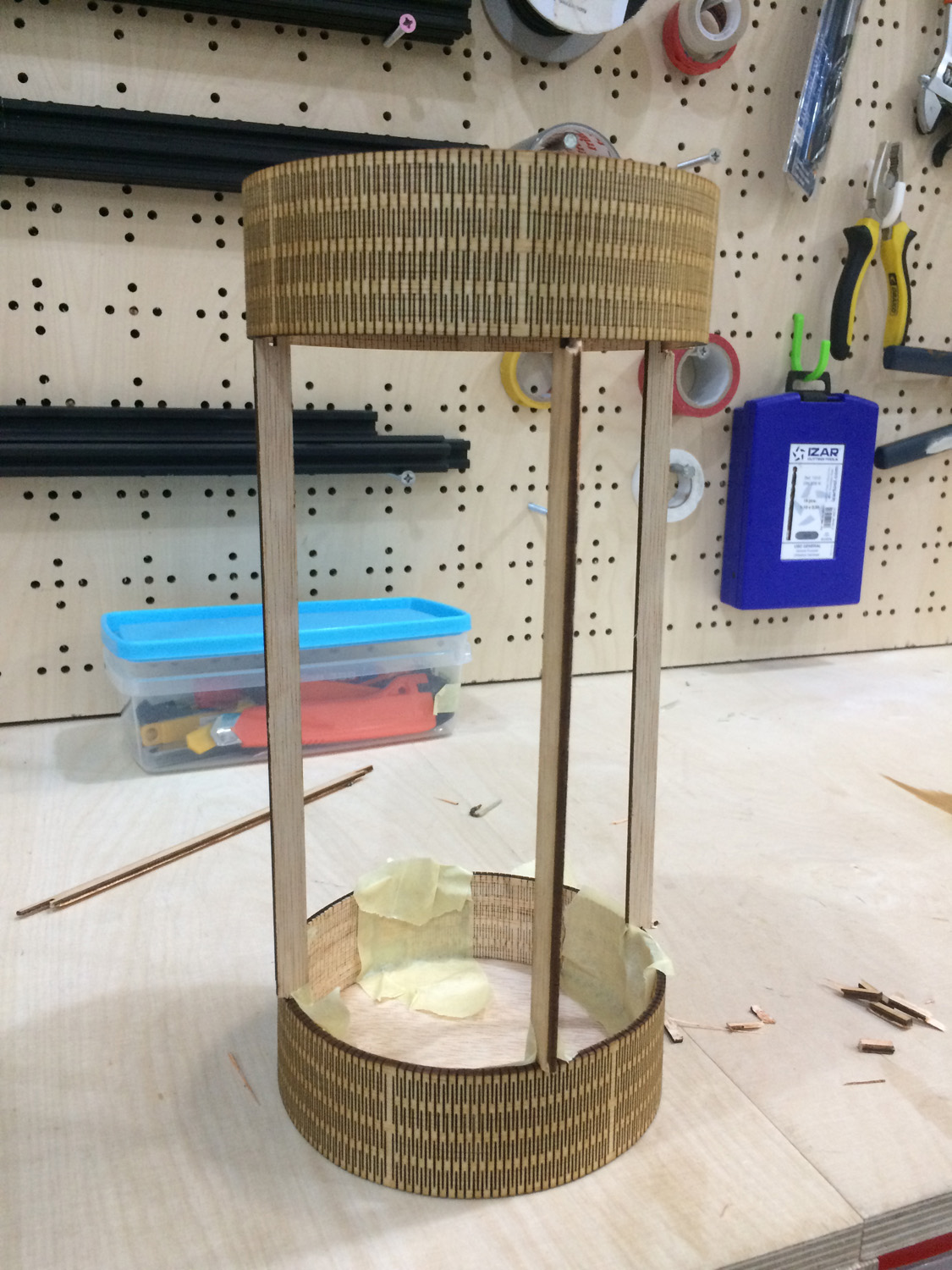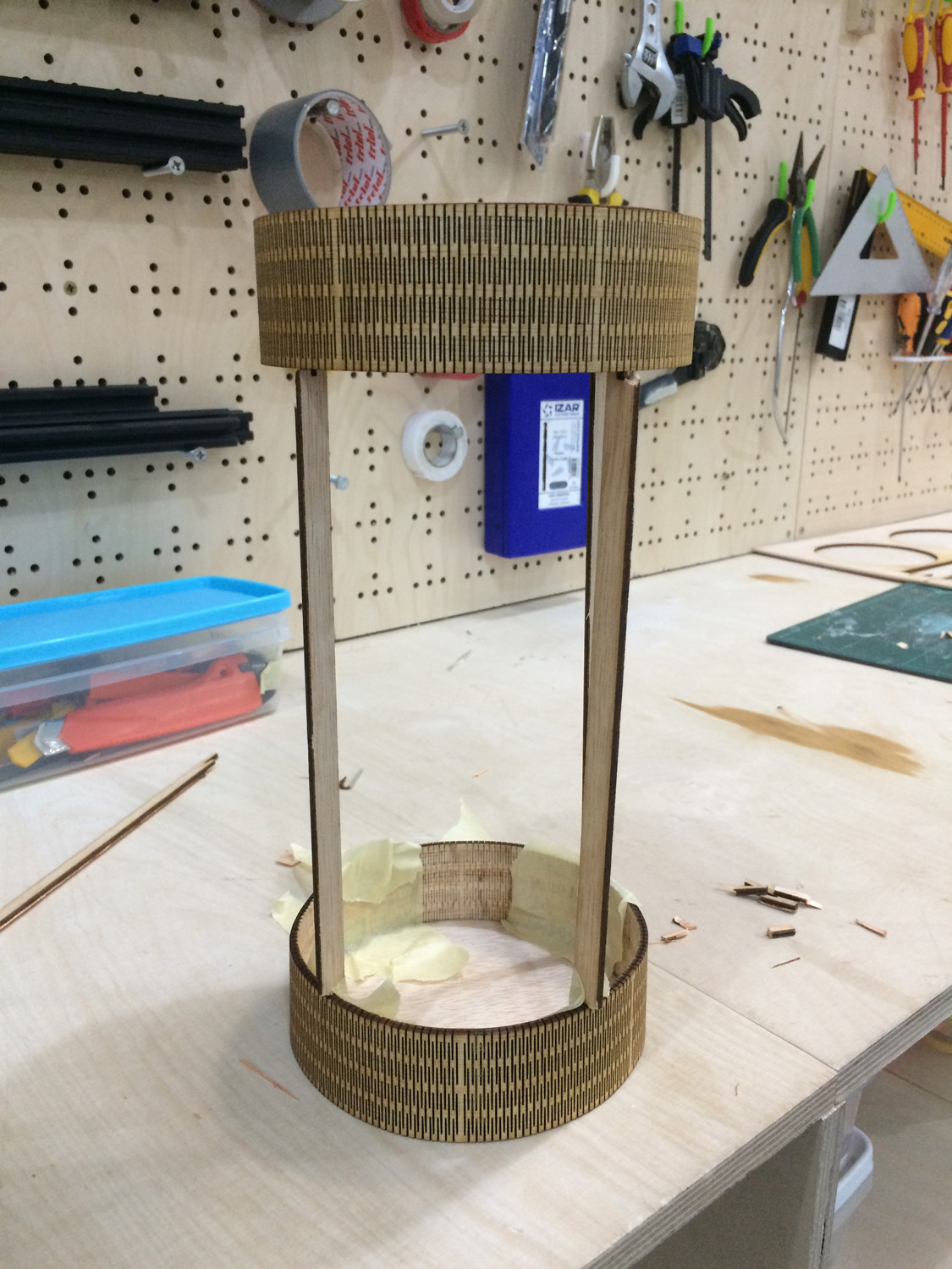 The original idea was to hang it to the ceiling but to make it more easily presentable Edu, one of our instructors, suggested to use transparent acrylic as a holder: