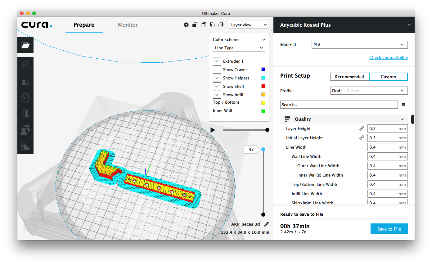 I exported the model into .STL, sliced in Cura using the preset settings for draft (0.2mm layer height) and 3D printed in PLA using the Anycubic that we have in the lab.