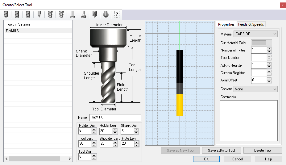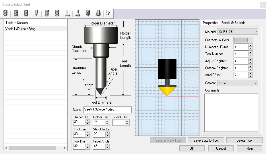 - 32mm 2 flutes 45 degrees Vee milling bit: I also had to measure the tool to input the parameters.