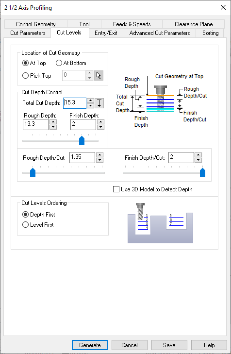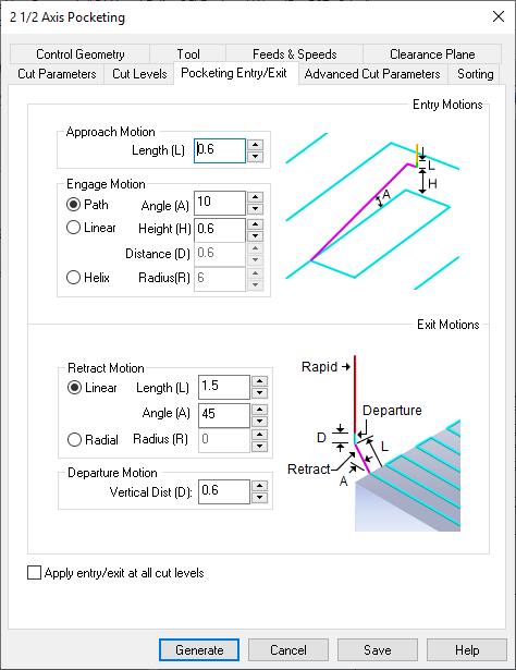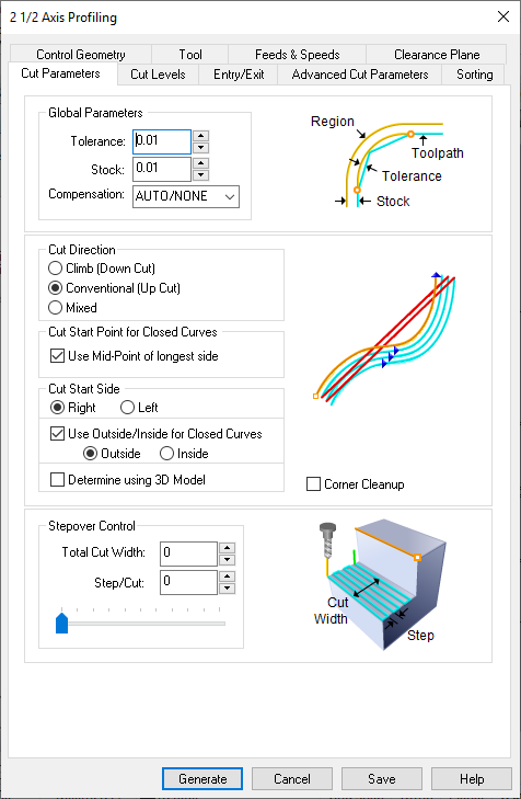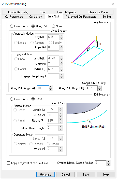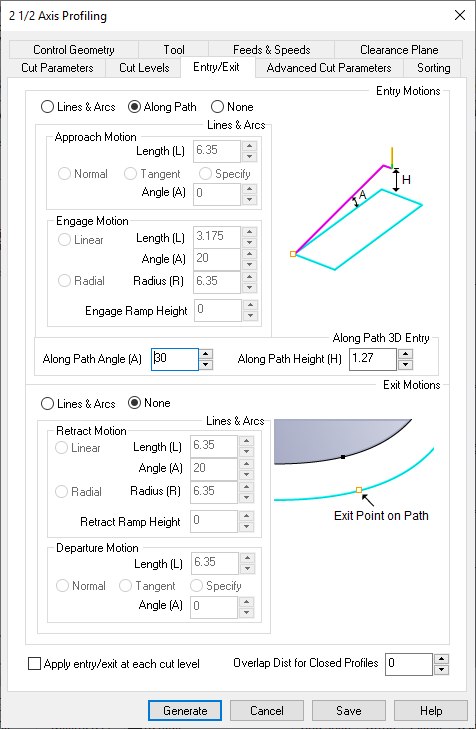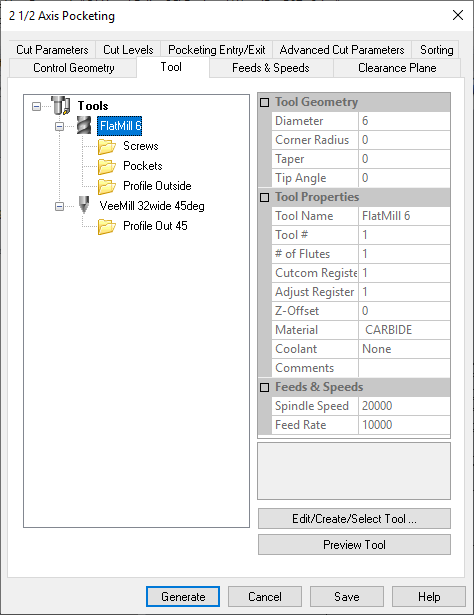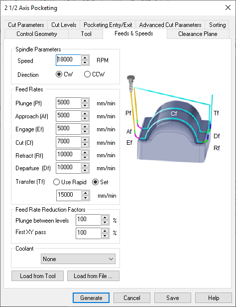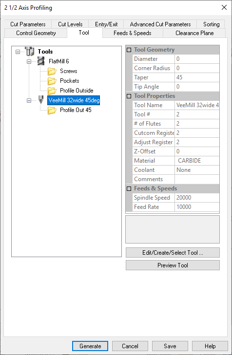 Profile 45: Speed: 20.000 RPM Plunge: 2.500 mm/min Approach: 5.000 mm/min Engage: 2.500 mm/min Cut: 2.500 mm/min Retract: 5.000 mm/min Departure: 10.000 mm/min Transfer: 15.000 mm/min