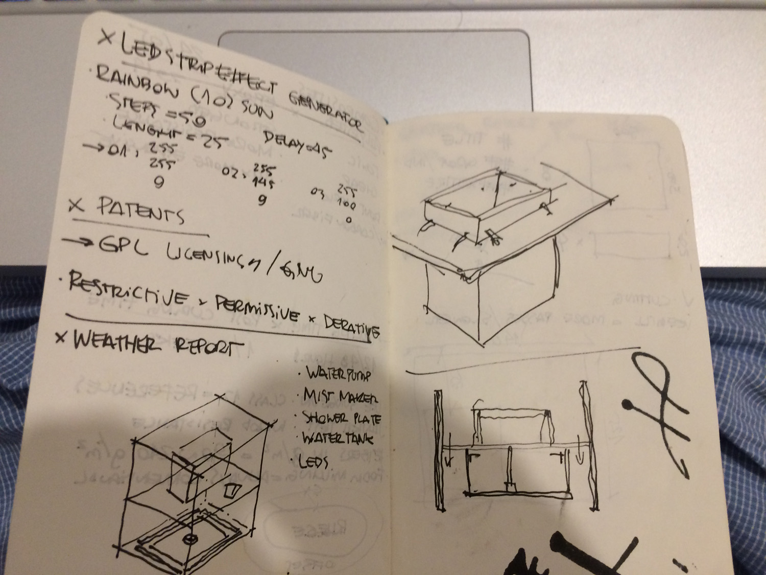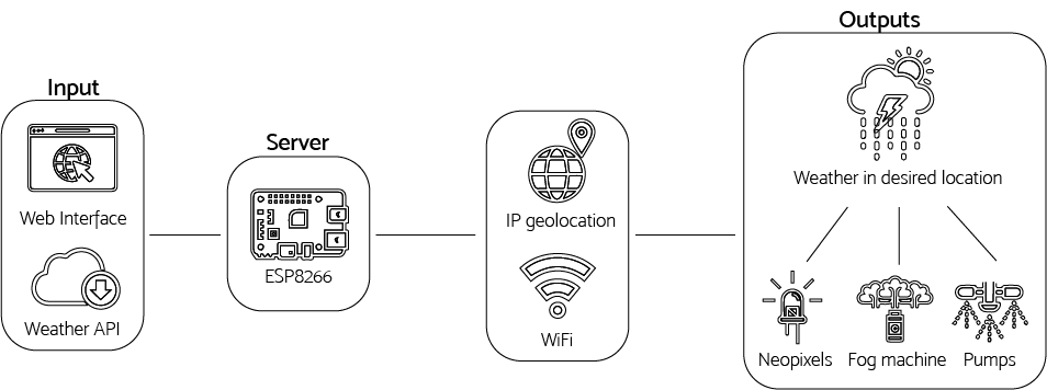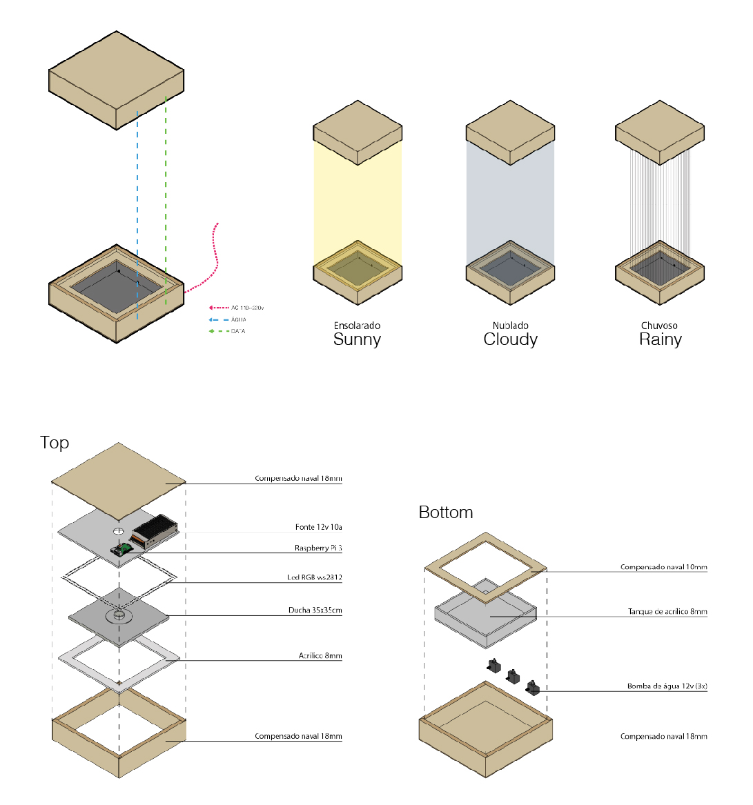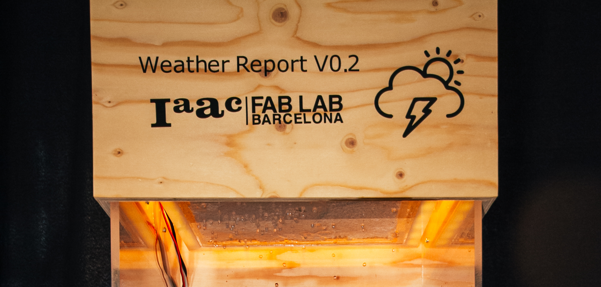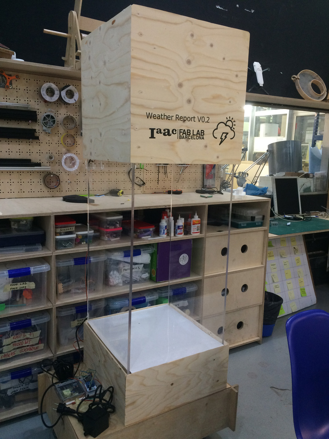 “Weather Report” is an installation that changes its behavior according the city that you choose. The object gets your input through an online form and uses an open API to know how is the weather in that place. With the result it make a visual output mimicking the weather in the place you chose. It works with pumps, neopixels and a fog generator to simulate the weather conditions (sunny, cloudy, rainy, rainy and foggy).