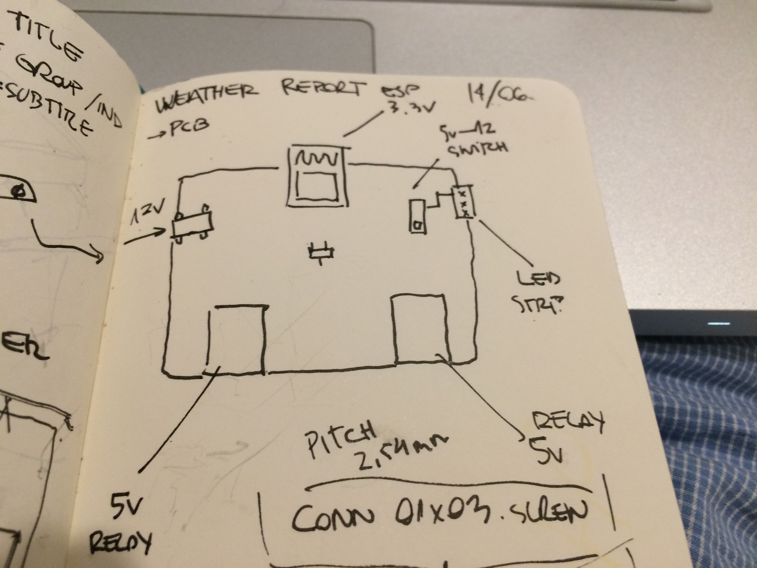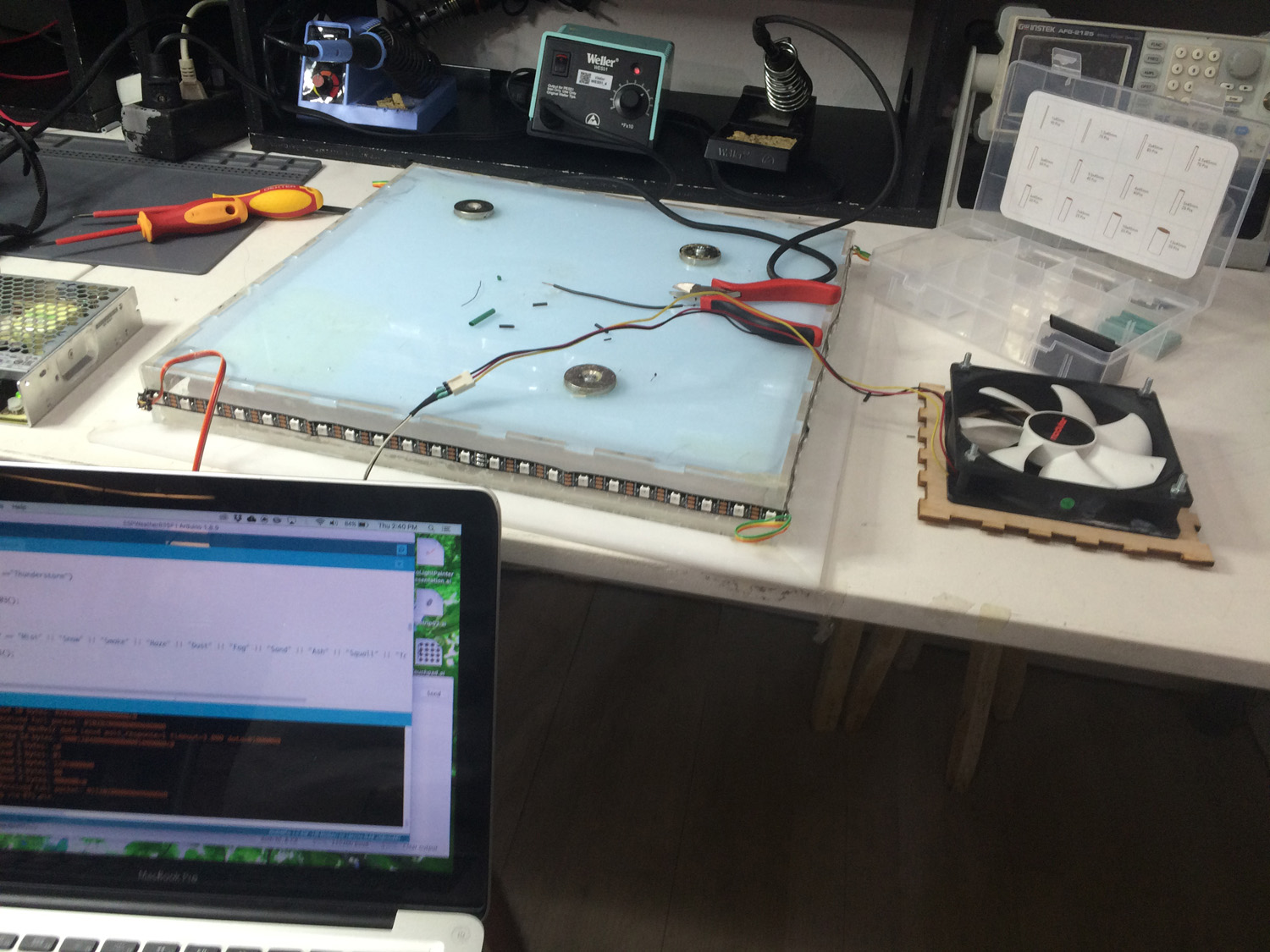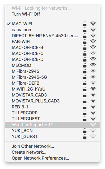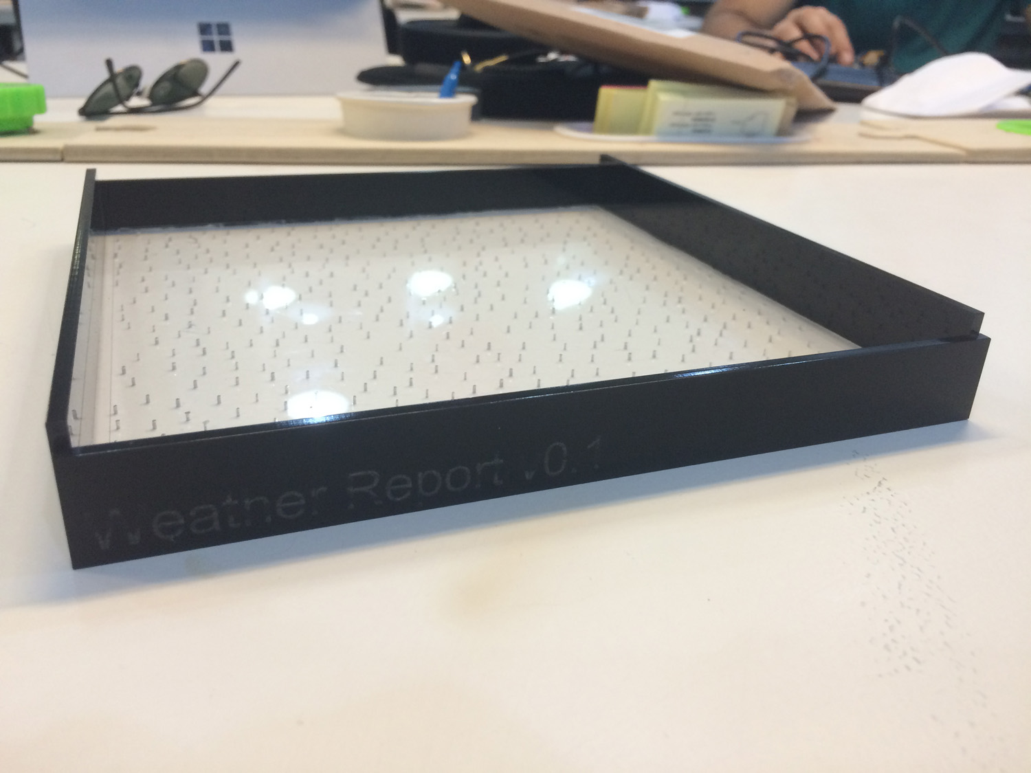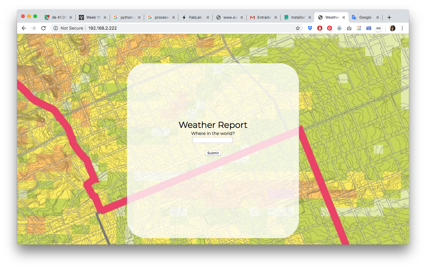 “Weather Report” is an installation that changes its behavior according the city that you choose. The object gets your input through an online form and uses an open API to know how is the weather in that place. With the result it make a visual output mimicking the weather in the place you chose. It works with pumps, neopixels and a fog generator to simulate the weather conditions (sunny, cloudy, rainy, rainy and foggy).