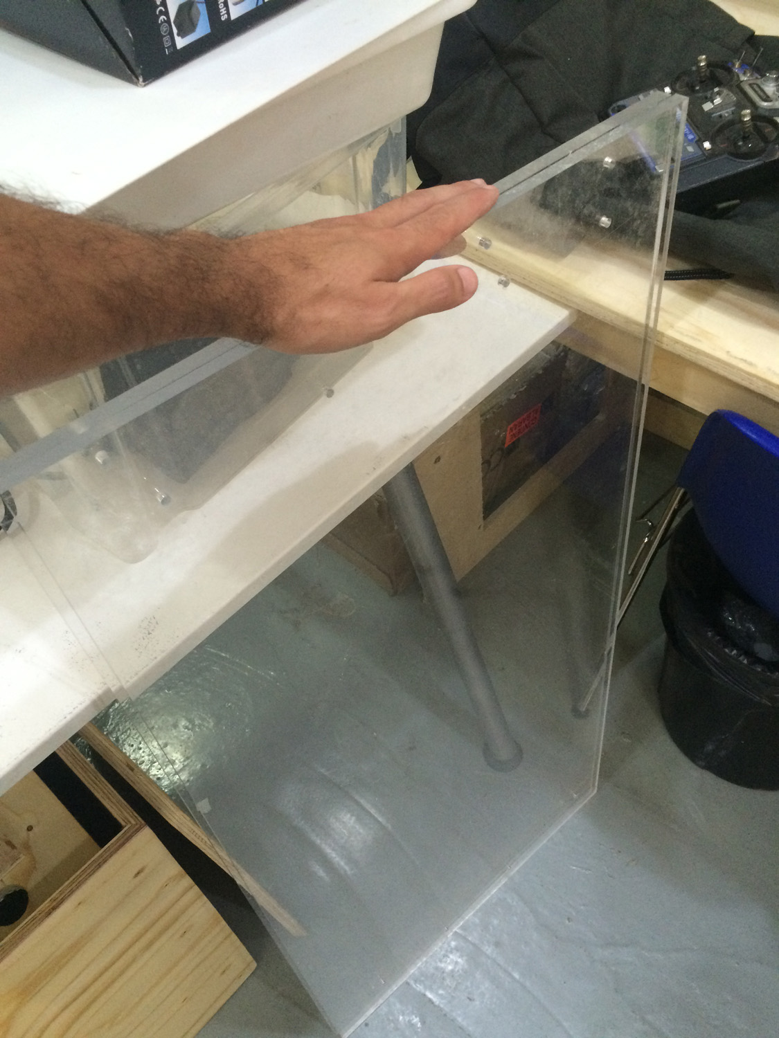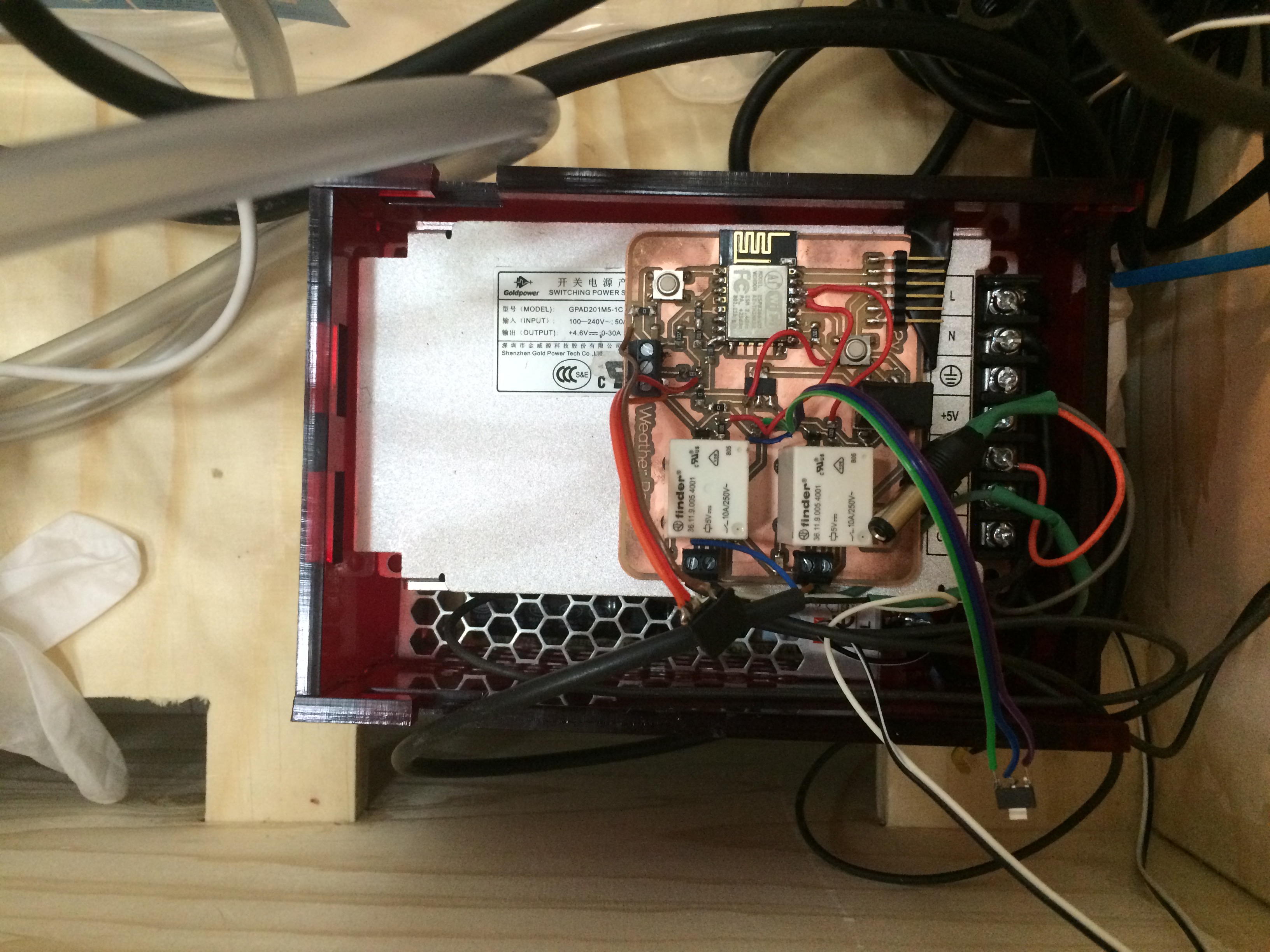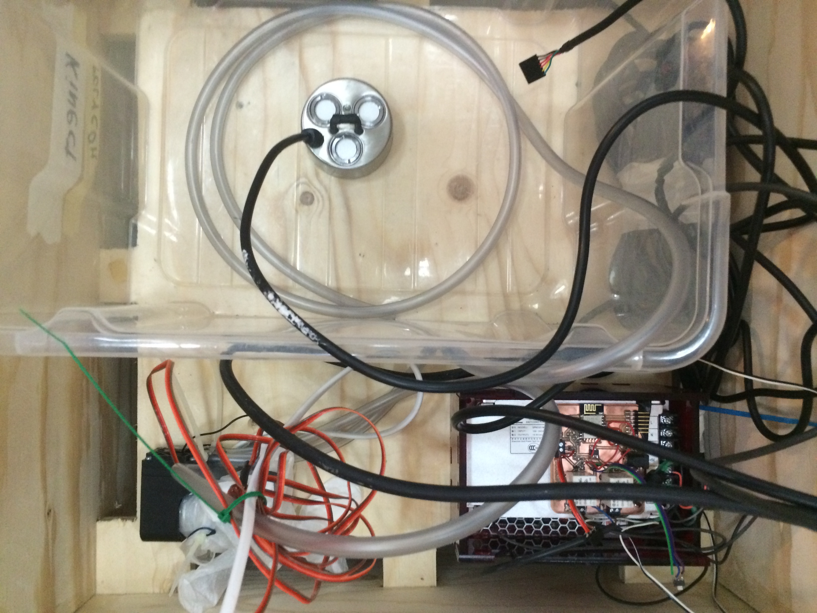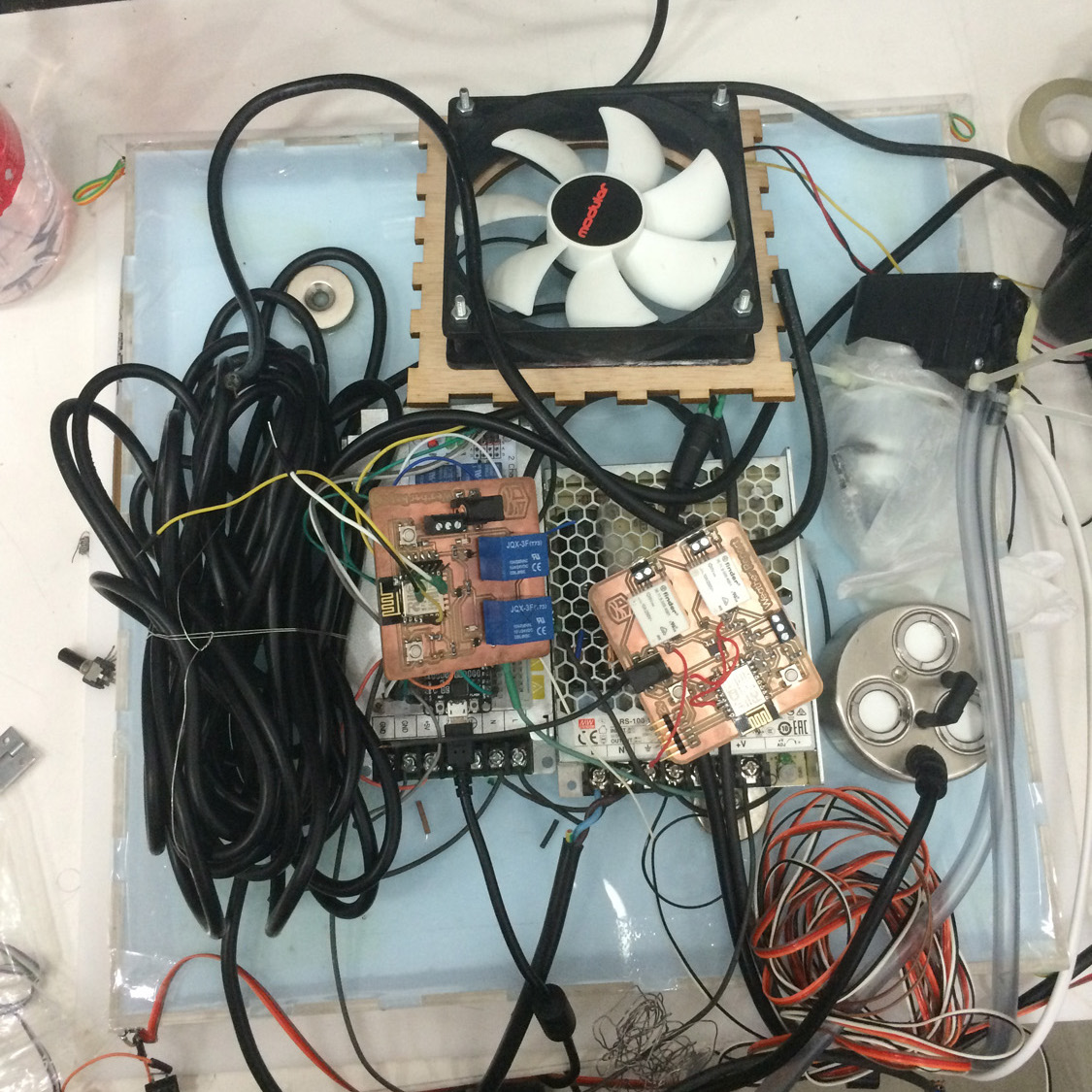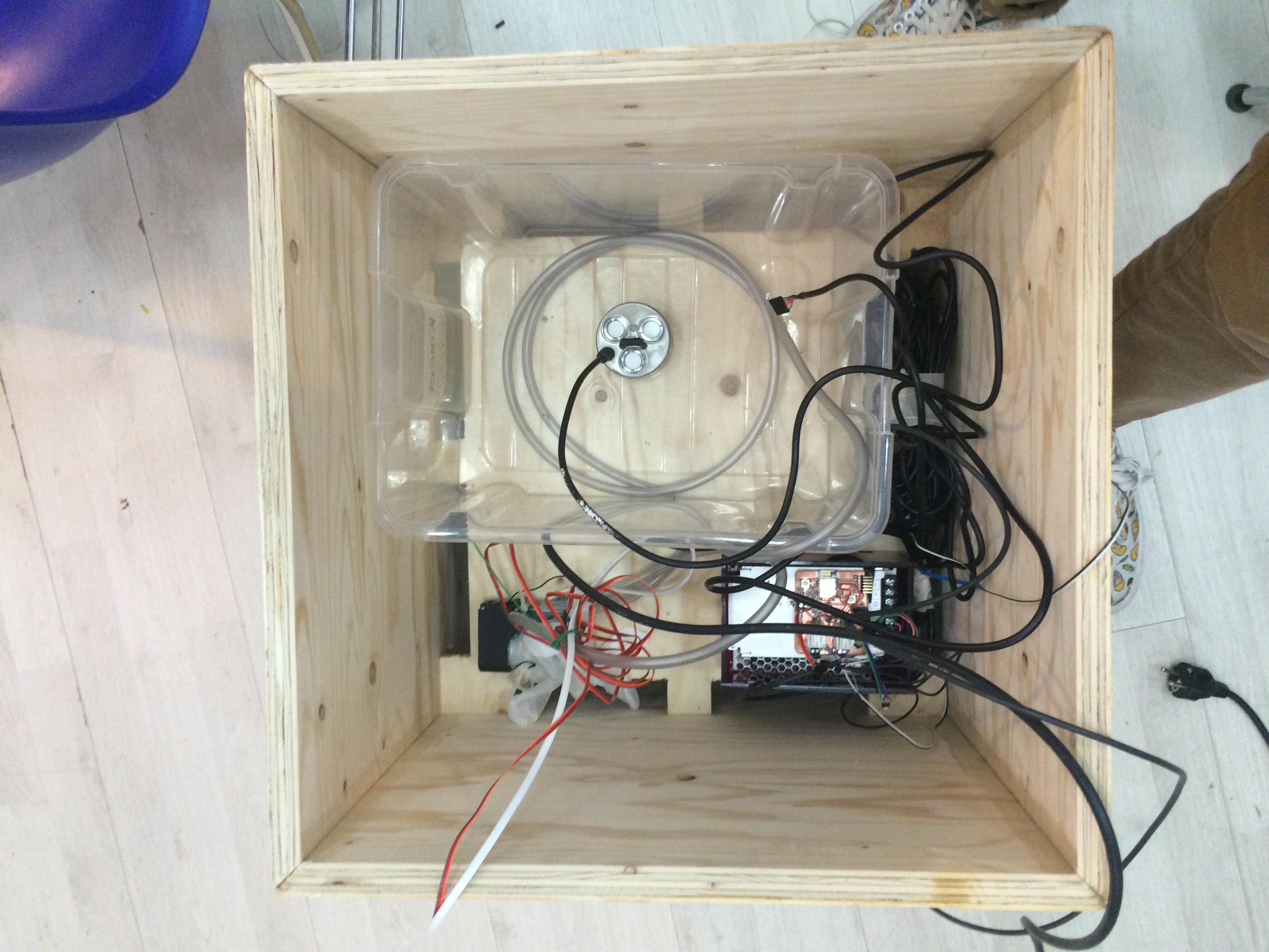You can see the water tank with the mist maker, the water pump protected by a latex glove to avoid the humidity and the box that holds all the electronics.